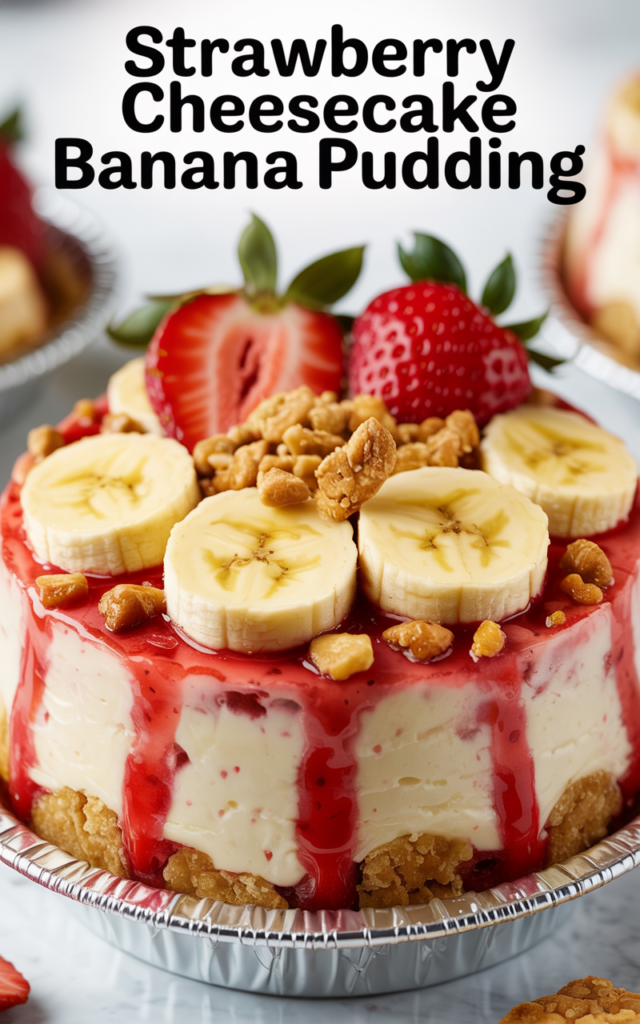 Enjoy the luscious harmony of creamy cheesecake, fresh strawberries, and banana pudding—all in one unforgettable dessert!