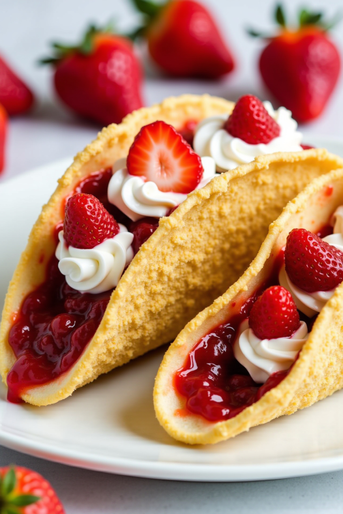 By combining a crisp shell, rich cheesecake filling, juicy strawberries, and nostalgic crunchy topping, these tacos strike a delicious balance between classic flavors and playful presentation—a dessert everyone will be excited to try!